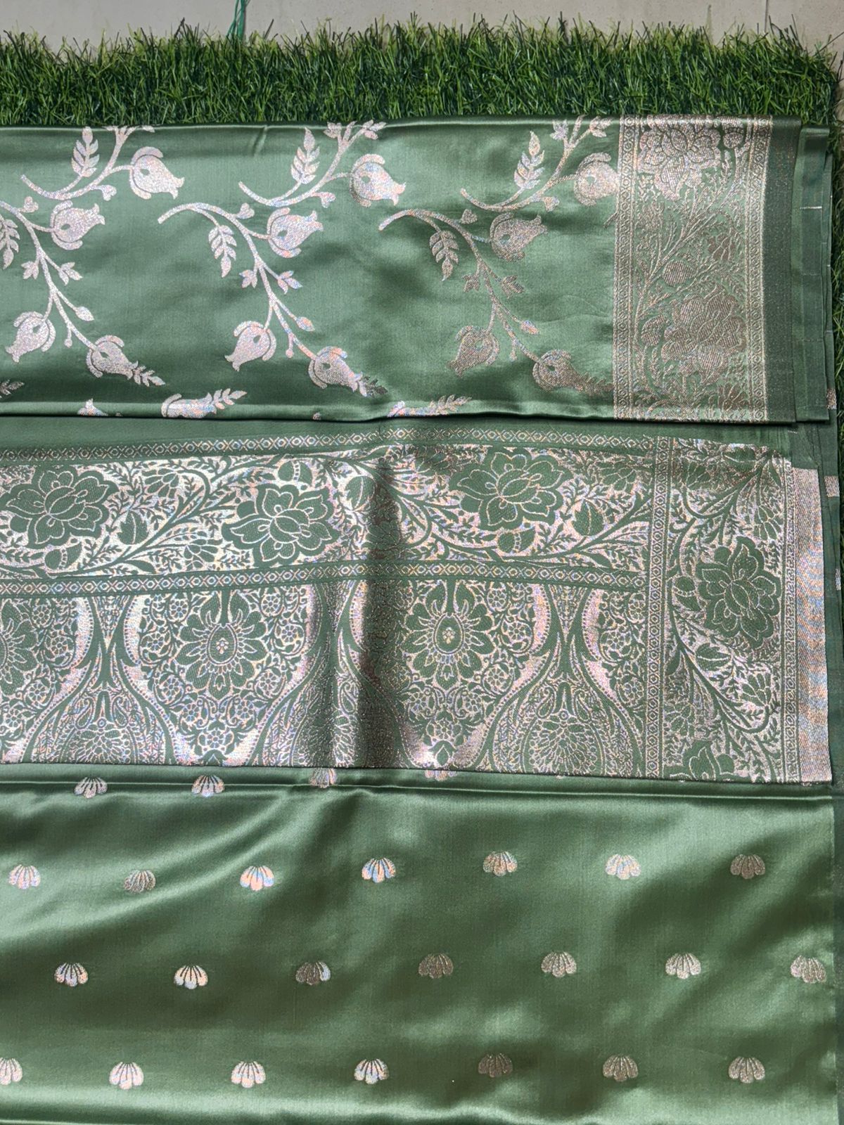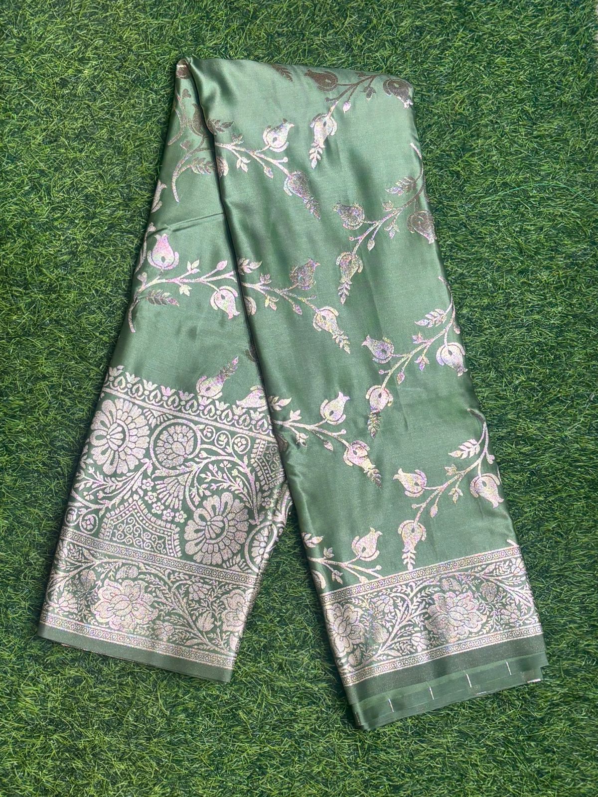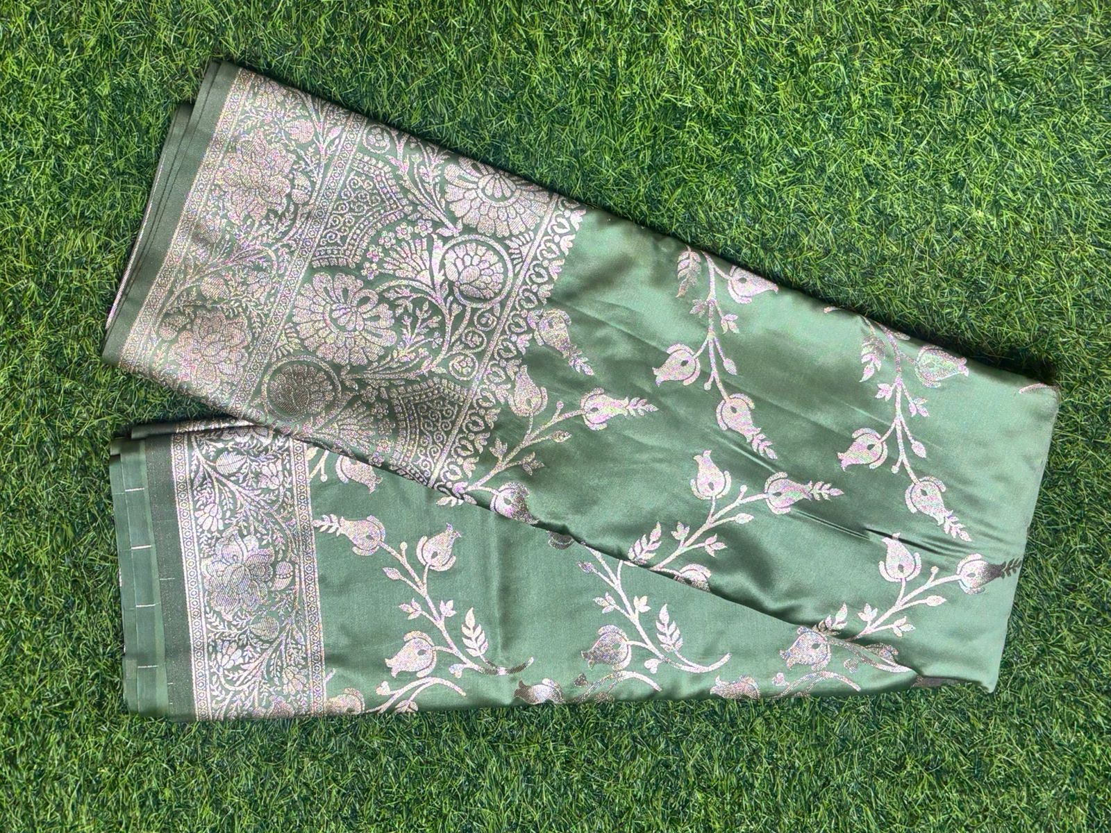 Embrace timeless elegance with this exquisite light green Banarasi silk saree, adorned with intricate silver zari floral and paisley motifs across the body and pallu. The lustrous fabric beautifully complements the rich woven border, making it perfect for festive occasions, weddings, and celebrations.