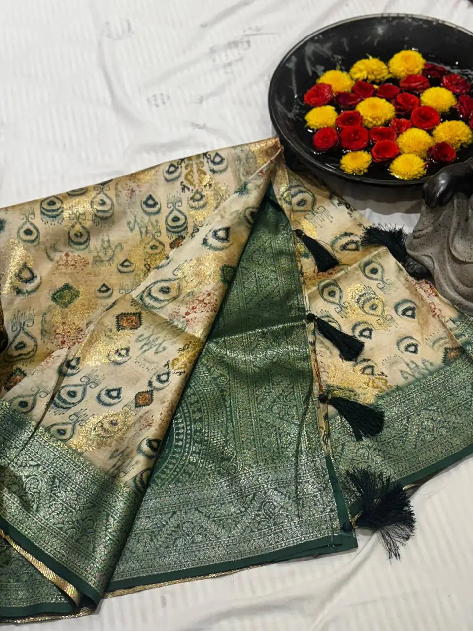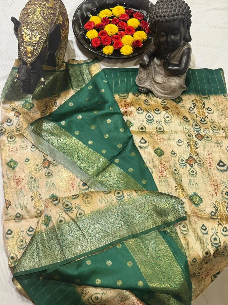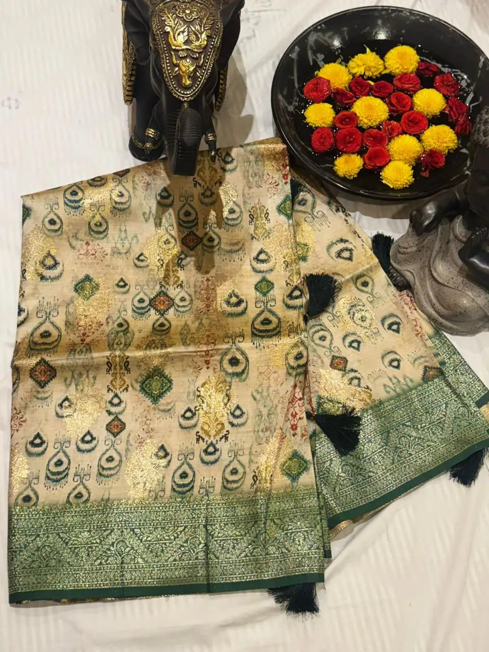 Embrace timeless elegance with our Soft Banarasi Saree with Ikat Motifs, crafted from luxurious soft silk and adorned with intricate zari weaving. The saree features a cream base with beautifully woven green and golden Banarasi motifs, finished with a rich green zari border and tassel detailing. Its lightweight fabric ensures easy draping while giving you a grand festive look – perfect for weddings, parties, and traditional occasions.